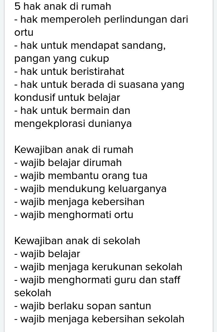 Hak adalah segala sesuatu yang harus diterima. Sebagai orang tua, sudah menjadi tugas untuk mengenalkan hak dan kewajiban anak di rumah. Setiap manusia memiliki hak dan kewajiban termasuk juga anak, dan sebagai pelajar juga. Anak juga harus mematuhi seluruh peraturan yang berlaku di rumah. Teman, itulah beberapa contoh hak, tetapi jangan lupa kamu juga harus menunaikan kewajibanmu sebagai anak di rumah, misalnya membantu orang tua, .