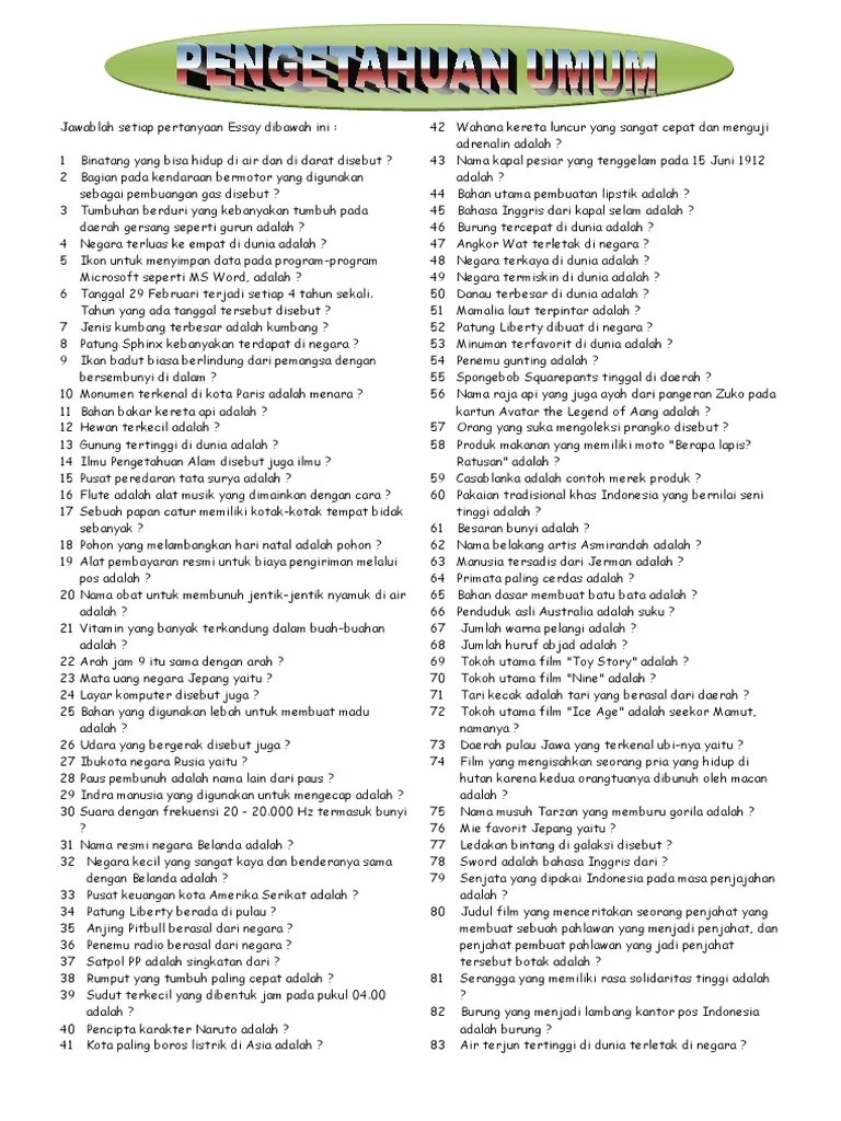 Contoh Soal Pengetahuan Umum Beserta Kunci Jawabannya - 1 : Contoh soal pengetahuan umum beserta kunci jawaban december 21 2014 at 6 14 pm antomi said.. Contoh soal pengetahuan umum beserta kunci jawaban soal tes pengetahuan umum.docx soal pengetahuan umum.docx soal pengetahuan umum contoh . Soal tes potensi akademik beserta kunci jawaban · test analogi verbal (korelasi makna) · test angka (arsimetik) · test bakat skolastik · test ketelitian · test koran . 13 9 2855 · soal lomba cerdas cermat jak pus1. Bagian pada kendaraan be.soal cerdas cermat pengetahuan umum smapengetahuan umum terkini. Soal psikotes tni polri download contoh soai.